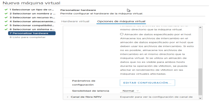En el apartado de Hardware también debe añadirse un parámetro necesario para Kubernetes. Este parámetro permite disponer un UUID consistente para la MV. Se introduce en el apartado Opciones de Máquina Virtual -> Avanzado -> Editar Configuración